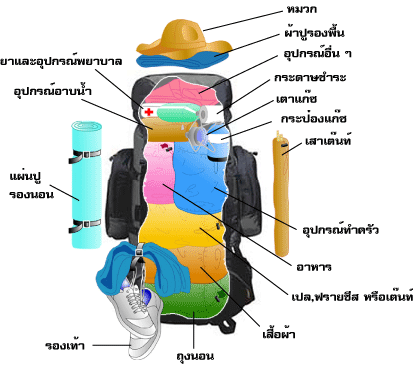 • เป้ เป็นสิ่งจำเป็นเพราะต้องใส่สัมภาระเสื้อผ้า ของใช้ เครื่องสำอาง ควรเลือกขนาดกระทัดรัดที่บรรจุของใช้ส่วนตัวได้หมด ( ของส่วนกลางทางผู้จัดทัวร์ใช้ลูกหาบแบก ) เป้มีหลายแบบ หลายระดับคุณภาพ